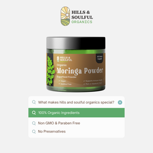 - At Hills & Soulful Organics, we're committed to superior quality and transparency. Our Moringa is passionately grown, ethically sourced, and produced with your health in mind.